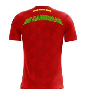 🎨 Design unique : couleur rouge dominante avec détails verts et jaunes, logo du club et inscriptions AS CARIBBEAN dans le dos.